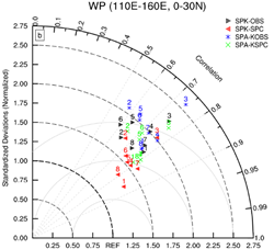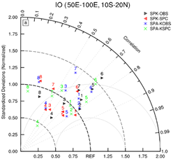 图1 (a) 印度洋和 (b) 西太平洋地区,四组模式BSISO降水异常Taylor图。符号上方数字代表BSISO的1–8位相。