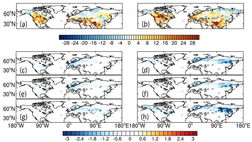Figure 2. Differences of 10-year seasonal mean latent heat (W/m2) between FLUXNET-MTE and the control run S01 in the Northern Hemisphere in two seasons: MAM (a) and JJA (b) (from the left column to the right column). And differences of 10-year seasonal mean latent heat between the control run and three sensitivity runs: S02 (c and d), S03 (e and f), and S04 (g and h) in the same two seasons.