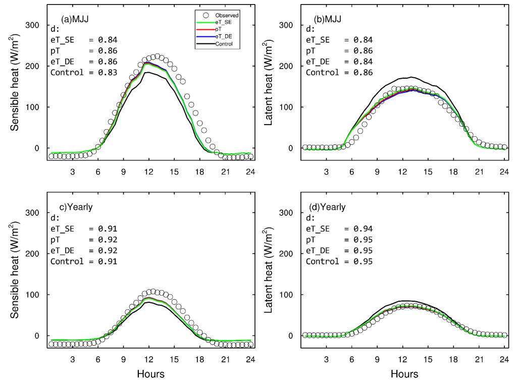 Figure 1. Comparison between observed and simulated annual mean half-hour values of latent and sensible heat fluxes during May, June, and July (MJJ, a and b) and whole year (c and d) at the FI-Let site from 2010 to 2011 with four model simulations: S01 (black, control), S02 (blue, eT_DE, one of the low soil temperature stress functions), S03 (red, pT, one of the low soil temperature stress functions) and S04 (green, eT_SE, one of the low soil temperature stress functions). The circle means observational values. The agreement indexes (d) for the corresponding period are also showed on the related figures.