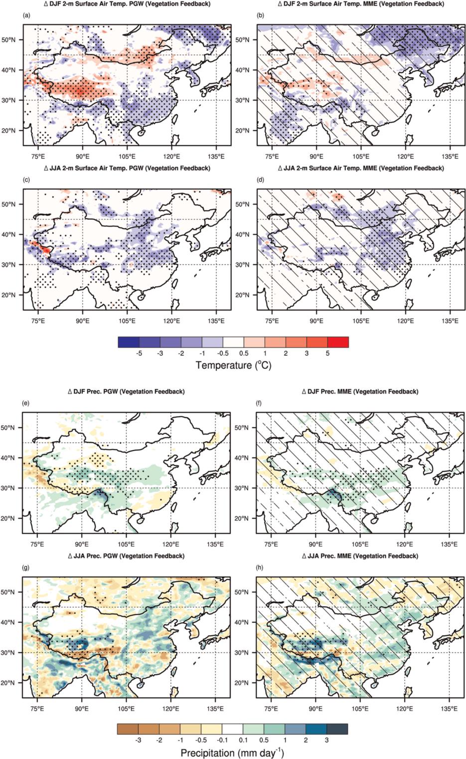 中国东北部和青藏高原可能是植被—大气相互反馈过程的“热点”区域:在RCP8.5的高排放情景下,夏季增温将可能使中国东北部的植被叶面积指数急剧减少,引起该地区冬季增温趋势减弱,夏季降水减少;然而在青藏高原,气温升高和夏季降水增多有利于植被增多,进一步促进夏季降水增多和冬季气温升高。