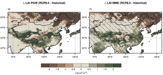 图:利用再分析订正气候变化场(左列)和多模式集合平均气候变化场(右列)驱动动态植被模式CLM-CNDV得到的RCP8.5情景下2081-2100相对于1981-2000年的LAI变化(第一行),以及由于植被反馈引起的冬季和夏季2米气温和降水变化。打点区域通过95%置信水平的t检验,斜杠区表示3/4的驱动模式结果同号。