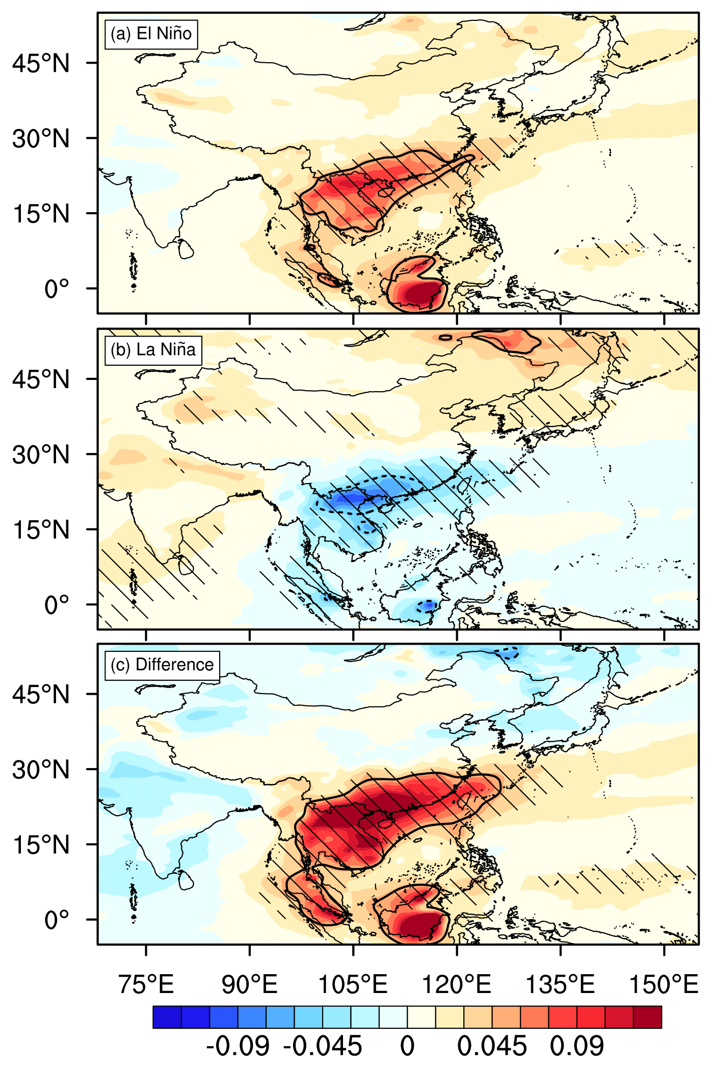 图1 东亚春季气溶胶光学厚度(AOD)异常值在(a) El Niño和(b) La Niña和(c) El Niño - La Niña年份的合成。黑色实线(虚线)所圈区域表示AOD异常大于(小于)0.05(−0.05)的区域,斜划线区域表示通过95%显著性检验。