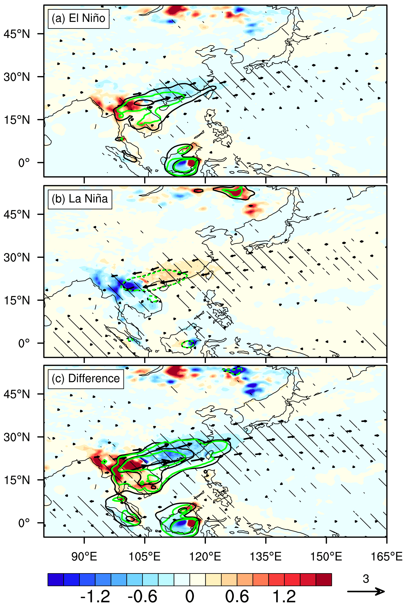 图2 总AOD(黑色等值线)、碳质气溶胶(CA)AOD(绿色等值线)和CA通量(黑色箭头;10−1 g m−1 s−1)及其散度(填充色;10−7 g m−2 s−1)分别在(a) El Niño和(b) La Niña和(c) El Niño - La Niña年份的合成值。斜划线和黑色箭头代表CA通量及其散度的异常值通过95%显著性检验。