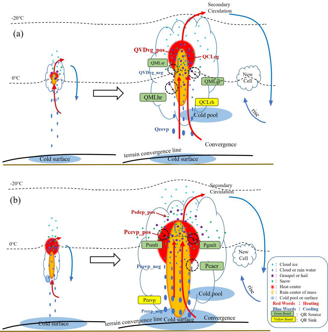图1 bulk方案 (a) 和bin方案 (b) 模似的2016年18-19日北京地区暴雨中尺度対流系統的形成机制概念模型图