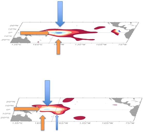 A schematic diagram illustrating MLS tendency and its contributing budget terms in winter during the peak stage of EP (top panel) and CP (bottom panel) El Niños, respectively. El Niño events are characterized by a negative MLS tendency which is indicted by the color shadow region; arrows indicate how the MLS budget terms are contributing to the negative MLS tendency: The yellow arrow indicates a positive contribution to the MLS tendency, whereas the blue arrow indicates a negative contribution to the MLS tendency. The sizes of the arrows indicate the relative amplitude of the contributions.