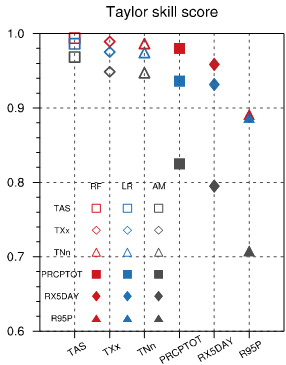图1 检验期1995-2014年,偏差订正后的算术平均(AM,灰色),线性回归(LR,蓝色),随机森林(RF,红色)集成方案对6个平均和极端温度与降水指数(不同图标)的泰勒技巧评分。