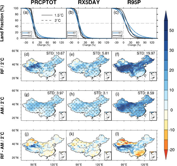图2 高排放情景SSP5-8.5路径下,1.5°C和2°C增温阈值下RF(蓝色)与AM(灰色)方案预估的平均与极端降水变化CDF分布(图a-c),2°C增温阈值下的空间分布图(图d-i)及其两种方案的空间差异分布(图j-l)。中国区域的空间标准差值STD在图d-i右上角给出。打点区域表示变化通过95%显著性检验。(单位:%)