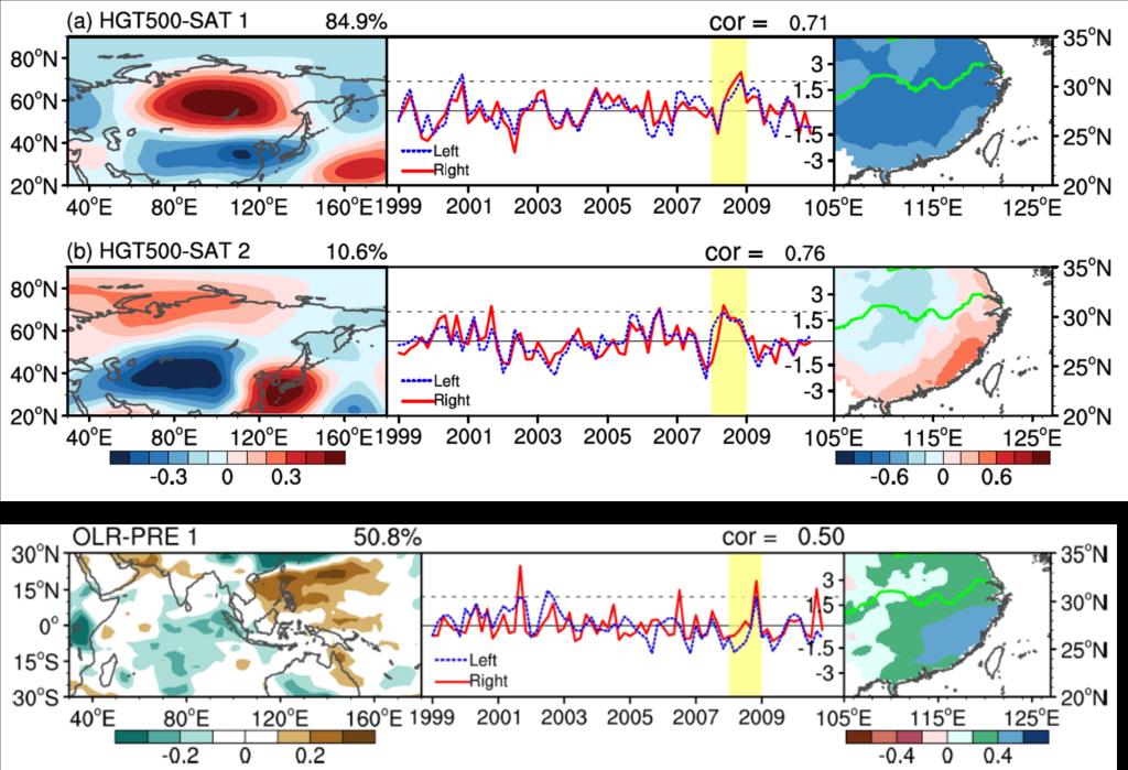 图2 奇异值分解(SVD)揭示的1月500hPa高度及OLR关键环流场(左)和同期中国南方温度及降水(右)的历史统计关系。黄色阴影反映2008年初PHSE过程。