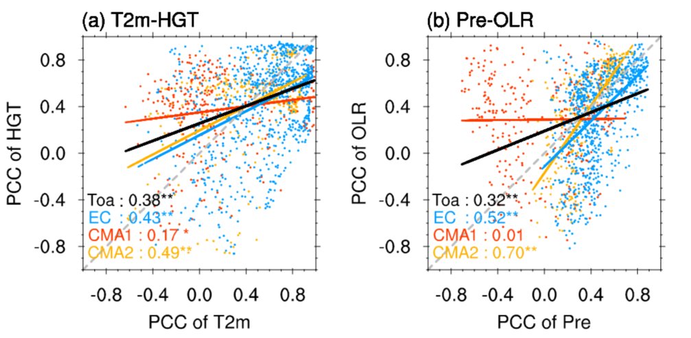 图1模式中(a)(20°–90°N, 30°–180°E)区域内500hPa高度场(反映西伯利亚高压)和中国南方地表气温异常以及(b)(30°S–30°N, 30°–180°E)区域内OLR(反映MJO活动)和中国南方降水异常的空间相关系数预测技巧的散点分布。图中黑色、蓝色、红色、橙色实线分别为全部模式(1368次预测)、ECWMF(792次预测)、CMA1.0(288次预测)、CMA2.0(288次预测)的两个变量空间相关系数预测技巧的线性拟合。左下角显示空间相关系数技巧的相关系数。*(**)表示相关系数通过90(95)%的置信度检验。