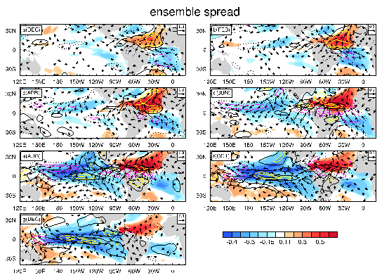 图1. 12月到次年12月(间隔1月,a-g)的海温(彩色阴影)、850-hPa风(矢量)、表面潜热通量(等值线,黄色为正,紫色为负)与热带大西洋海温和850-hPa风场集合成员间差异的SVD第一主分量(PC1)的相关系数分布