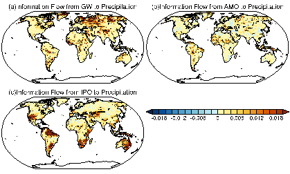 图1 GW、AMO和IPO对1934-2015年期间陆地降水的信息流分布