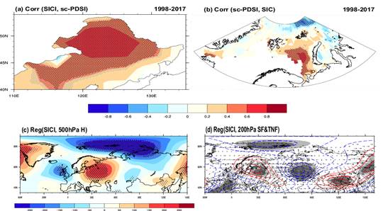 (a)1998-2017年海冰指数(SICI)和中国东北地区sc-PDSI相关系数的空间分布;(b)1998-2017年春季北极地区海冰密集度(SIC)和中国东北地区的sc-PDSI指数的相关系数的空间分布;(c)海冰指数(SICI)对500 hPa位势高度场(gpm)的回归分布;(d)海冰指数对200hPa流函数(SF; 105m2/s)、水平波作用通量(TNF; m2/s2)的回归分布
