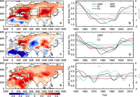 研究发现,自1950年以来欧亚地区夏季气温的年代际变化是由内部变率和外强迫共同导致,其中欧洲-西亚和东亚地区超过一半的变化是由外部强迫(即温室气体和气溶胶)贡献,而不是主要由气候系统内部自然变率(如大西洋多年代际变率,AMO)主导。研究成果不仅为理解欧亚夏季气温的年代际变化机理提供了新证据,也进一步证实了人类活动有关的外强迫对欧洲-西亚和东北亚的影响。