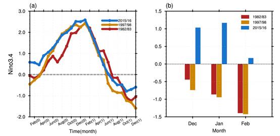 图1. (a) 三次El Niño事件Niño3.4区海温的演变。 (b) 三次El Niño事件成熟期冬季月平均RMM指数异常。