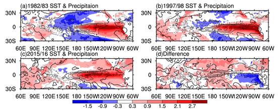 图2. (a) 1982/83 (b)1997/98 (c)2015/16年海温(阴影,℃)以及降水(等值线,mm)异常分布,(d) 2015/16年与1982/83、1997/98年的差异。