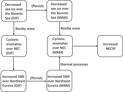 研究表明,中国东北春季降水的主导模态表现为全区一致型并伴随显著的年际变化,且与前期冬季巴伦支海海冰密集度异常具有显著的负相关关系。前冬巴伦支海海冰的减少可以导致其上空的正位势高度异常,削弱了极涡和绕极西风,并在西西伯利亚区域上空形成气旋性环流异常。一方面,这样的环流异常可以导致欧亚中高纬度地区前冬雪水当量异常呈纬向偶极子分布,即东欧地区的雪水当量偏少,而西西伯利亚地区的雪水当量偏多。前冬雪水当量异常可以维持到随后的春季,并通过局地热力过程影响欧亚大陆上空的环流异常,使得中国东北地区春季降水偏多。另一方面,前冬的巴伦支海海冰减少可以持续到春季,它可加强中国东北地区上空的气旋性环流异常导致该地区春季降水的增加。本工作进一步利用线性斜压模式验证了大气环流对欧亚大陆雪水当量异常的响应,并使用NCAR CAM5.3模式验证了中国东北春季降水变化对前期冬季巴伦支海海冰减少的响应。