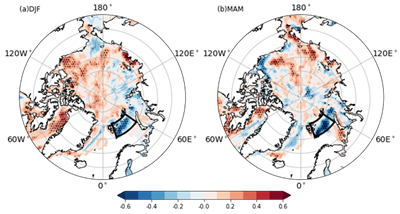 图1 中国东北春季降水主导模态的年际变化与前期冬季(a)及同期春季(b)北极海冰密集度的相关系数分布