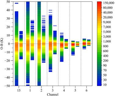 图1. 2019年6月-8月NOAA19 AMSU-A通道1-6和15 剔除有云观测前(左侧)和剔除云检测后(右侧)在不同O−B区间内(间隔1K)数据量的分布,填色为数据量。