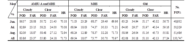 表1 2019年6月至8月亚洲东部陆地晴空和有云状况下,3种方法的检出率(POD)、误检率(FAR)和正确率(HR)评分,以MODIS云分类产品作为参考。
