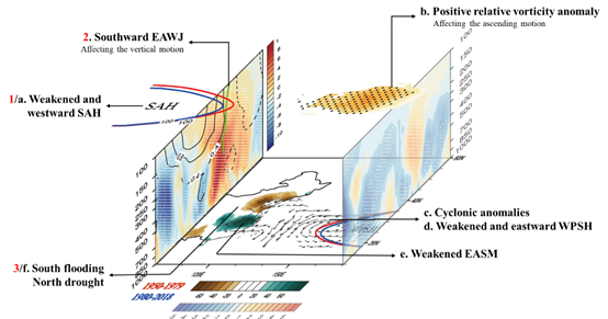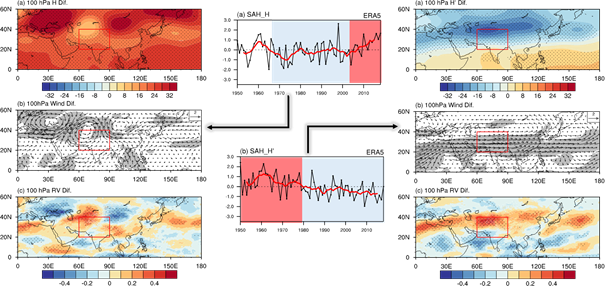 南亚高压作为位于对流层中高层的深厚、稳定且强大的高压系统,对东亚、南亚乃至整个北半球的夏季气候有着显著的影响。在中国,南亚高压次季节、季节、年际以及年代际的多时间尺度变化与东部雨带复杂的时空分布特征密切相关。但是传统上主要是用位势高度来表示南亚高压的变化,而位势高度在全球增暖的背景下容易受抬升效应影响产生虚假的年代际信号。因此,基于扣除纬向平均后的扰动位势高度,王会军院士团队重新讨论了南亚高压的年代际变化及其对东亚气候的影响,相关成果发表于《Journal of Climate》。