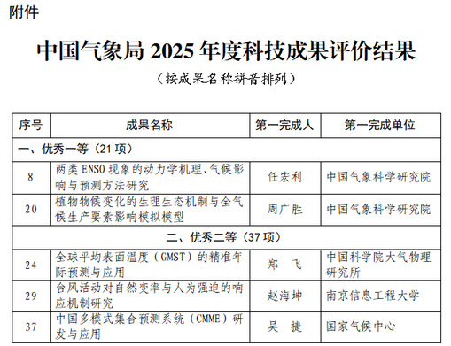 任宏利研究员牵头的成果“两类ENSO现象的动力学机理、气候影响与预测方法研究”、周广胜研究员牵头的成果“植物物候变化的生理生态机制与全气候生产要素影响模拟模型”获评“优秀”一等,郑飞研究员牵头的成果“全球平均表面温度(GMST)的精准年际预测与应用”、赵海坤教授牵头的成果“台风活动对自然变率与人为强迫的响应机制研究”、吴捷研究员牵头的成果“中国多模式集合预测系统(CMME)研发与应用”获评“优秀”二等。