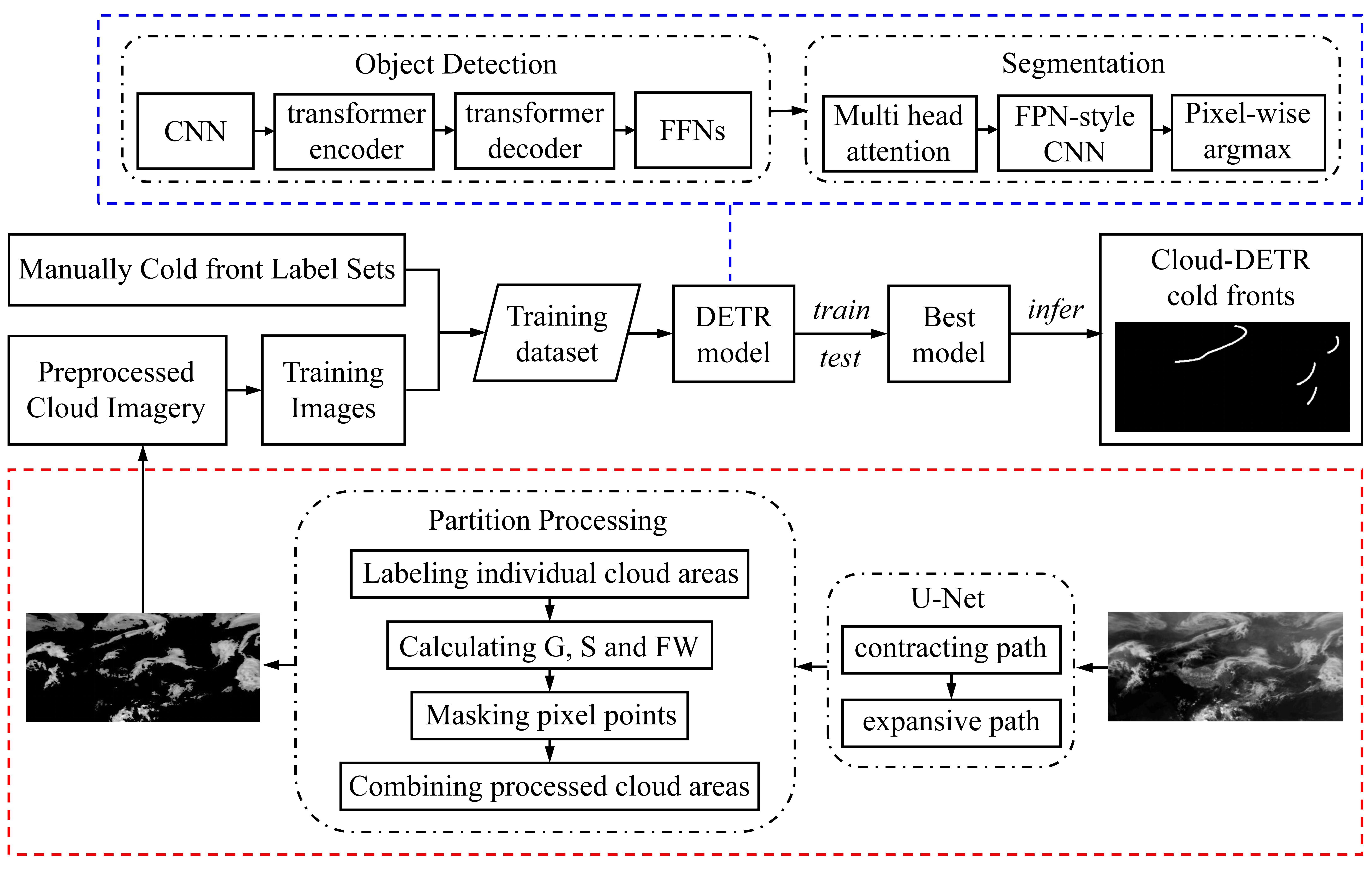 图1 Cloud-DETR方法的总体工作流程(红色虚线框表示基于U-Net和分区处理的红外云图预处理;蓝色虚线框表示DETR模型的目标检测和分割步骤)