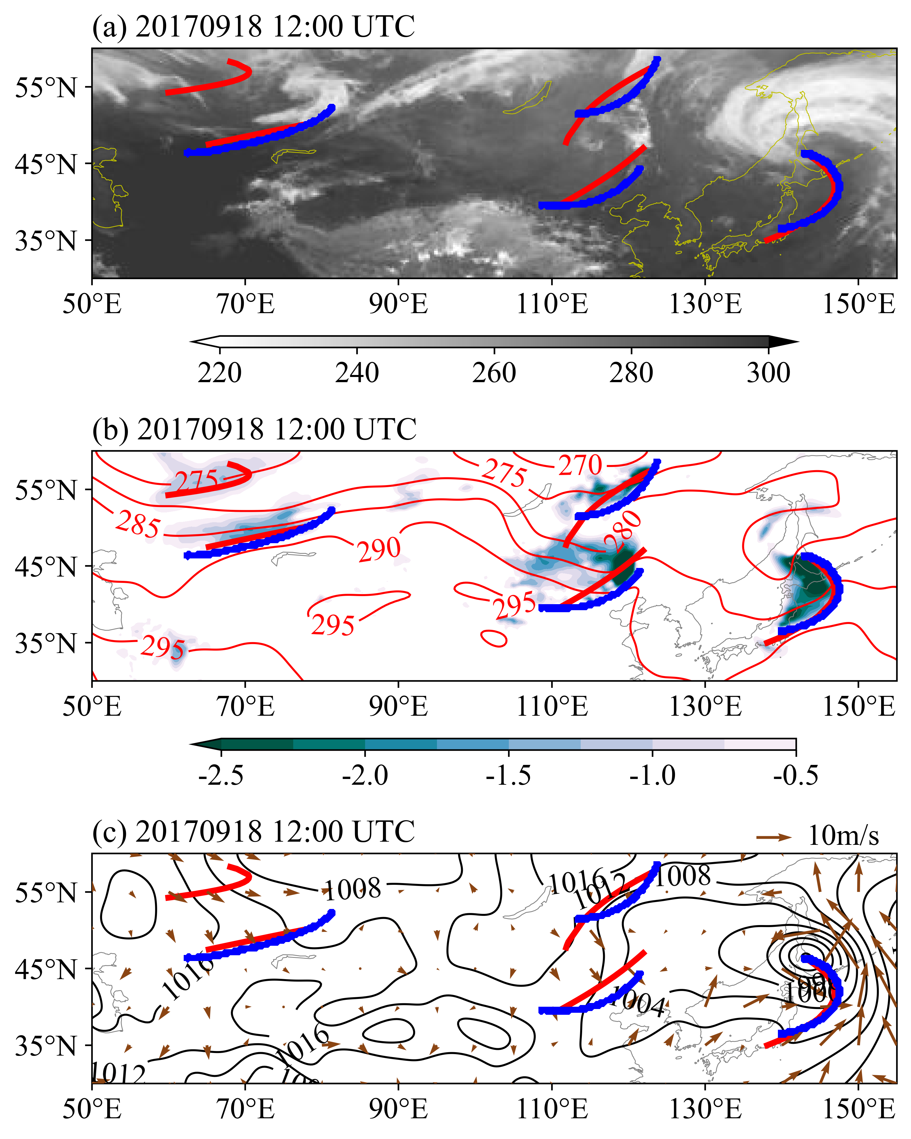 图3 2017年9月18日12:00 UTC使用Cloud-DETR方法识别的冷锋(蓝色线)和“两步法”识别的冷锋(红色线):(a)FY-2G红外亮度温度(阴影,单位:K);(b)850 hPa冷平流(阴影,单位:10–4 K·s–1)、850 hPa温度(红色等值线,单位:K);(c)海平面气压场(黑色等值线,单位:hPa)和地面10 m风场(箭头,单位:m·s–1)