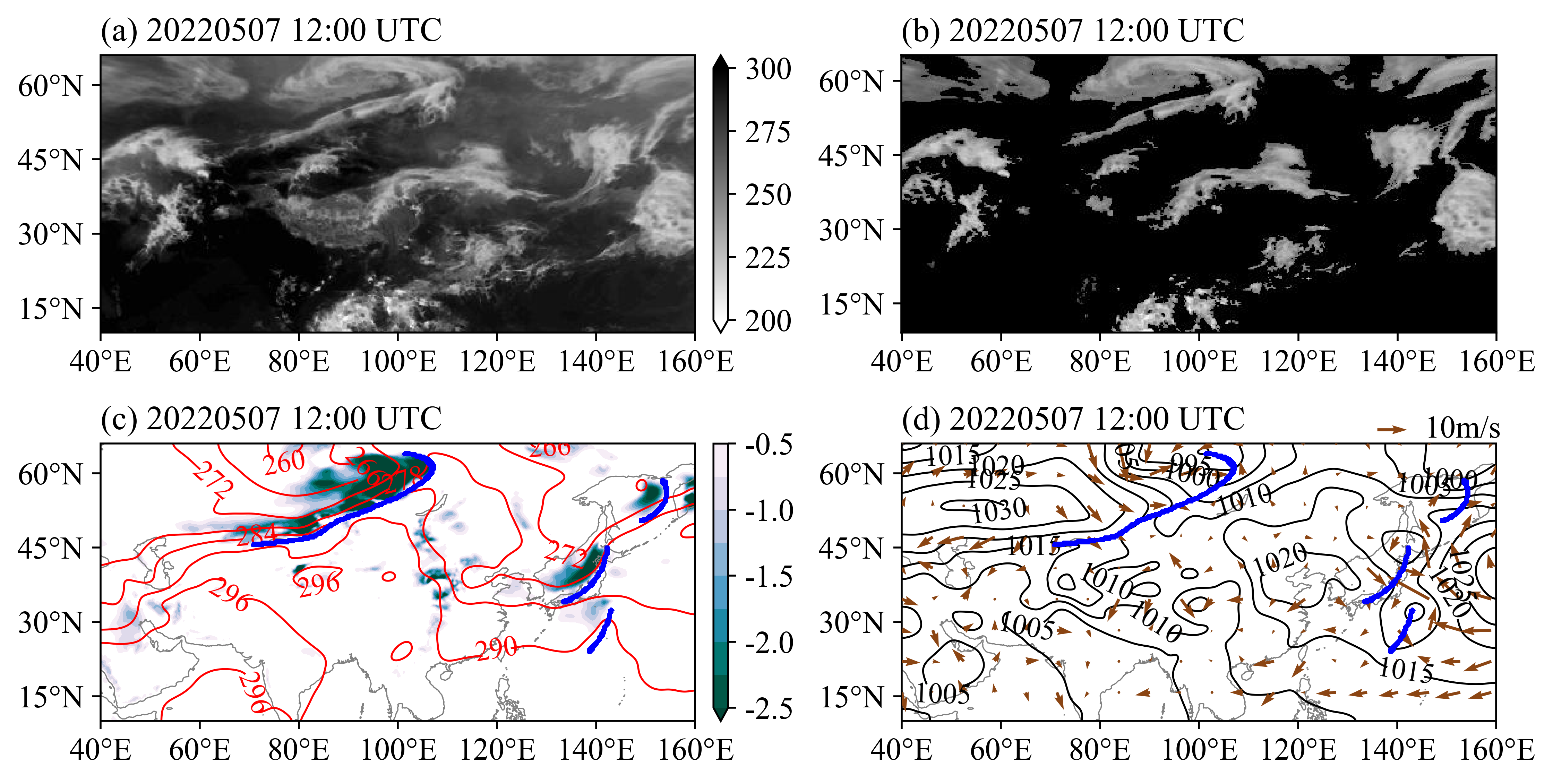 图2 2022年5月7日12:00 UTC使用Cloud-DETR方法识别的冷锋:(a)FY-2G红外亮度温度(阴影,单位:K);(b)预处理后的云图;(c)Cloud-DETR冷锋(蓝色线),850 hPa冷平流(阴影,单位:10–4 K·s–1)和850 hPa温度(红色等值线,单位:K);(d)Cloud-DETR冷锋(蓝色线)、海平面气压(黑色等值线,单位:hPa)和地面10 m风(箭头,单位:m·s–1)