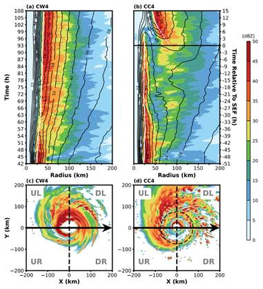 图2 (a)正(CW4)、(b)负(CC4)螺旋度试验中1km高度轴对称切向风(等值线,m s-1)和3km高度雷达反射率(阴影,dBZ)。白色实线和虚线分别为主要最大风半径和次级大风半径。(b)图中黑色实线为外眼墙生成时间。(c)正、(d)负螺旋度试验中0时刻(定义为负螺旋度试验中外眼墙形成时间)的3km高度雷达反射率水平分布。黑色箭头表示深层切变矢量;(d)图中黑色虚线圈表示75km半径。