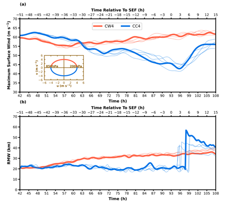 图1 (a)近地面最大风速(单位:m s-1)随时间变化,(b)最大风半径(Radius of Maximum Wind,RMW;单位:km)随时间变化。蓝色和红色实线分别表示负螺旋度环境(CC4)和正螺旋度环境(CW4)试验,其中粗线表示控制试验结果,细线为集合试验结果。