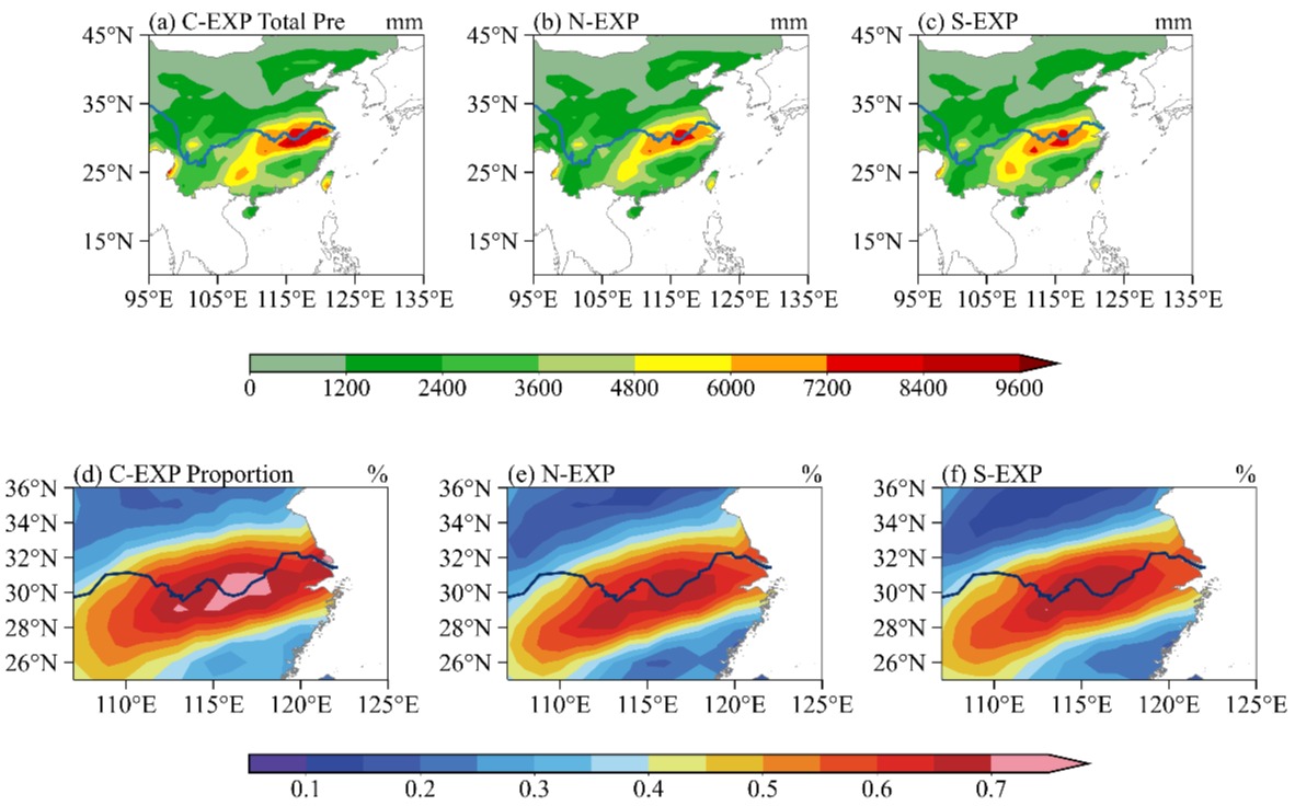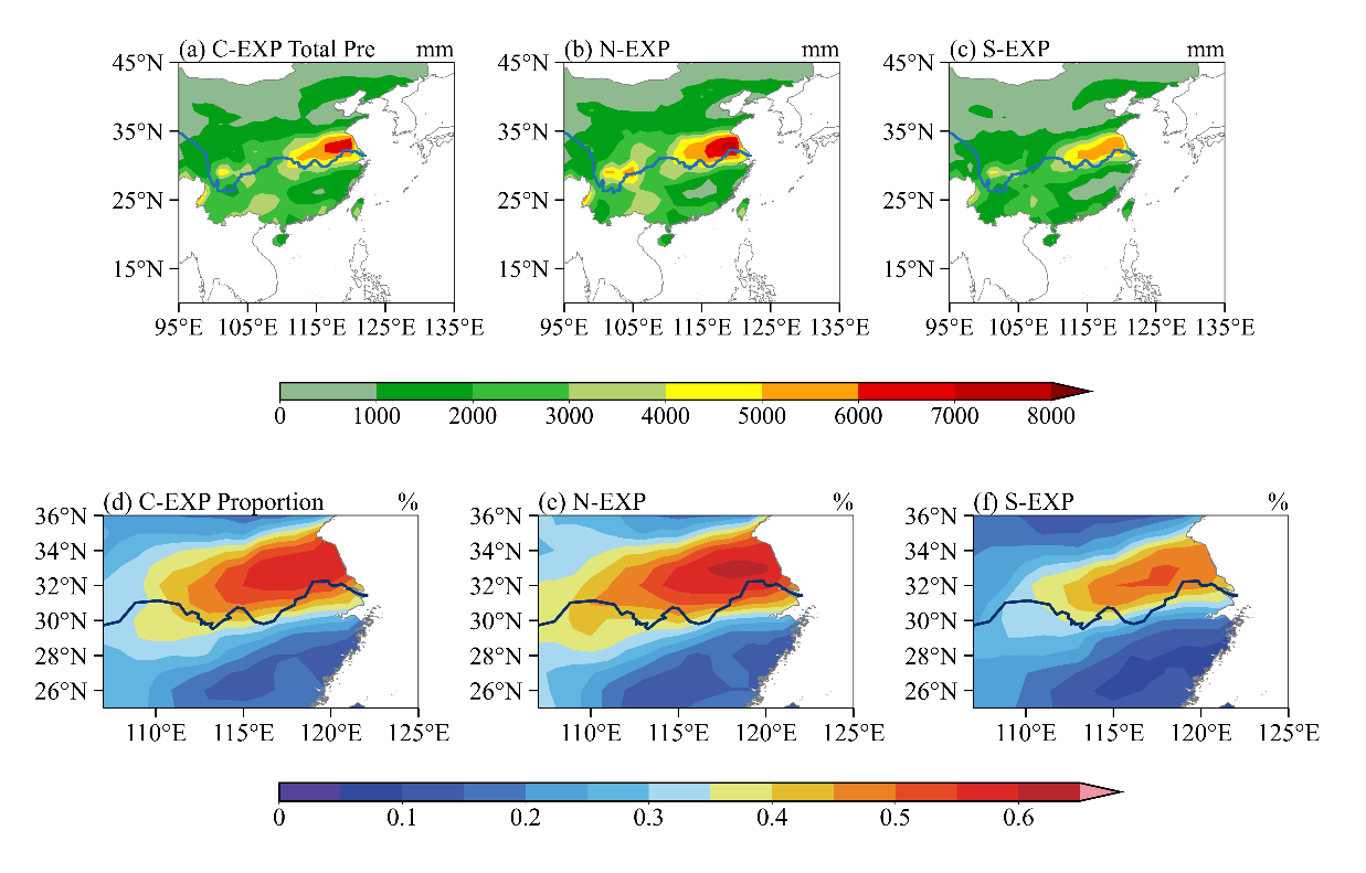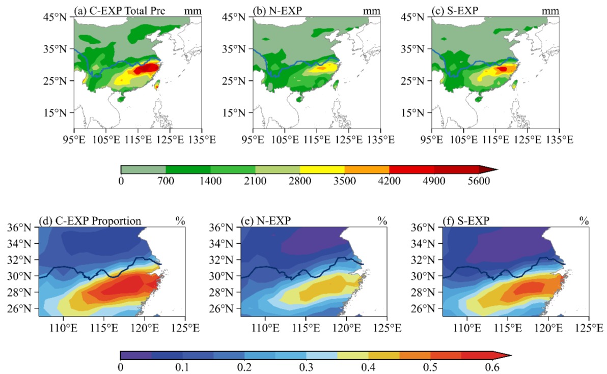 图2 边界扰动对江南区持续性降水(a-c,单位:mm)及其占梅雨期总降水比例(d-f,单位:%)的影响,其中,(a)、(d)控制试验;(b)、(e)北边界试验;(c)、(f)南边界试验