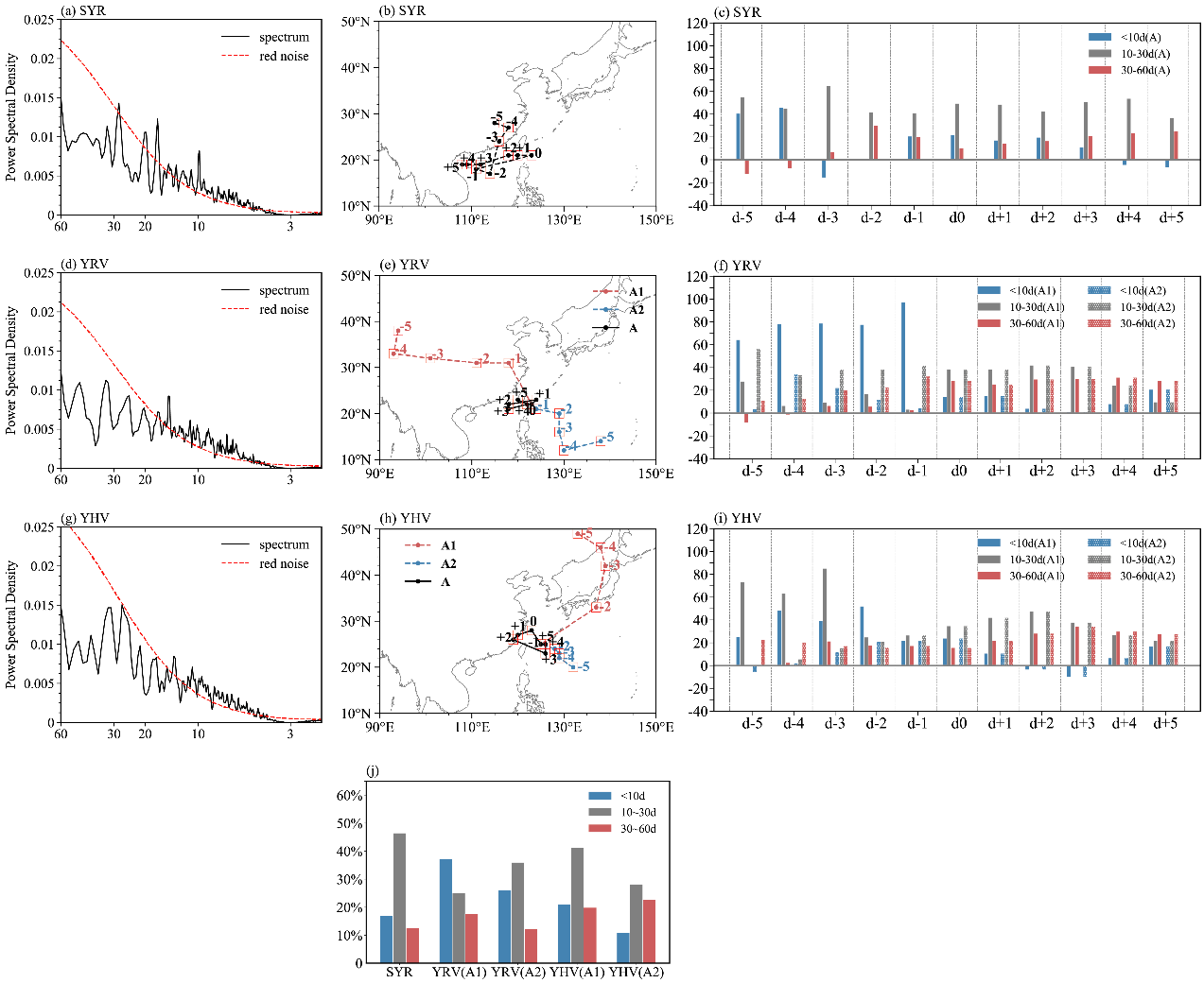 图1 1979-2020年梅雨期持续性降水的功率谱分析(a: 江南区;d:长江中下游区;g:江淮区)及影响持续性降水的-5至5天500 hPa异常反气旋路径(第0天表示降水开始日;b:江南区;e:长江中下游区;h:江淮区),不同尺度位势分量对关键异常反气旋贡献的时间演变(c:江南区;f:长江中下游区;i:江淮区。单位:%)及不同尺度位势分量对异常反气旋的累积(-5至5天平均)贡献率(j,单位:%)。图b、e、h中红色框表示异常反气旋中心位置