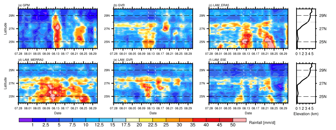 图3 时间-纬度图:逐日降水量在高原南坡陡峭地形区域的时间演变