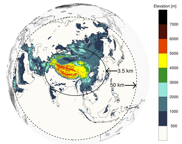中心研究团队聚焦青藏高原陡峭地形区域,围绕对流可分辨尺度模拟,开展了基于自主创新的GRIST全球-区域一体化模式的区域降尺度研究。GRIST区域模式是基于其全球模式,依托一套完全相同的模式代码发展而来。在模式发展过程中,区域模式经过严格的“Acid test”检验,实现了全球与区域模拟的一致性对比,为模式应用奠定坚实基础。同时,依托其所支持的变分辨率配置,区域降尺度可实现从外部粗分辨率区向内部高分辨率区的平滑过渡(图1),避免传统逐级嵌套方案带来的区域内“有缝”干扰。
