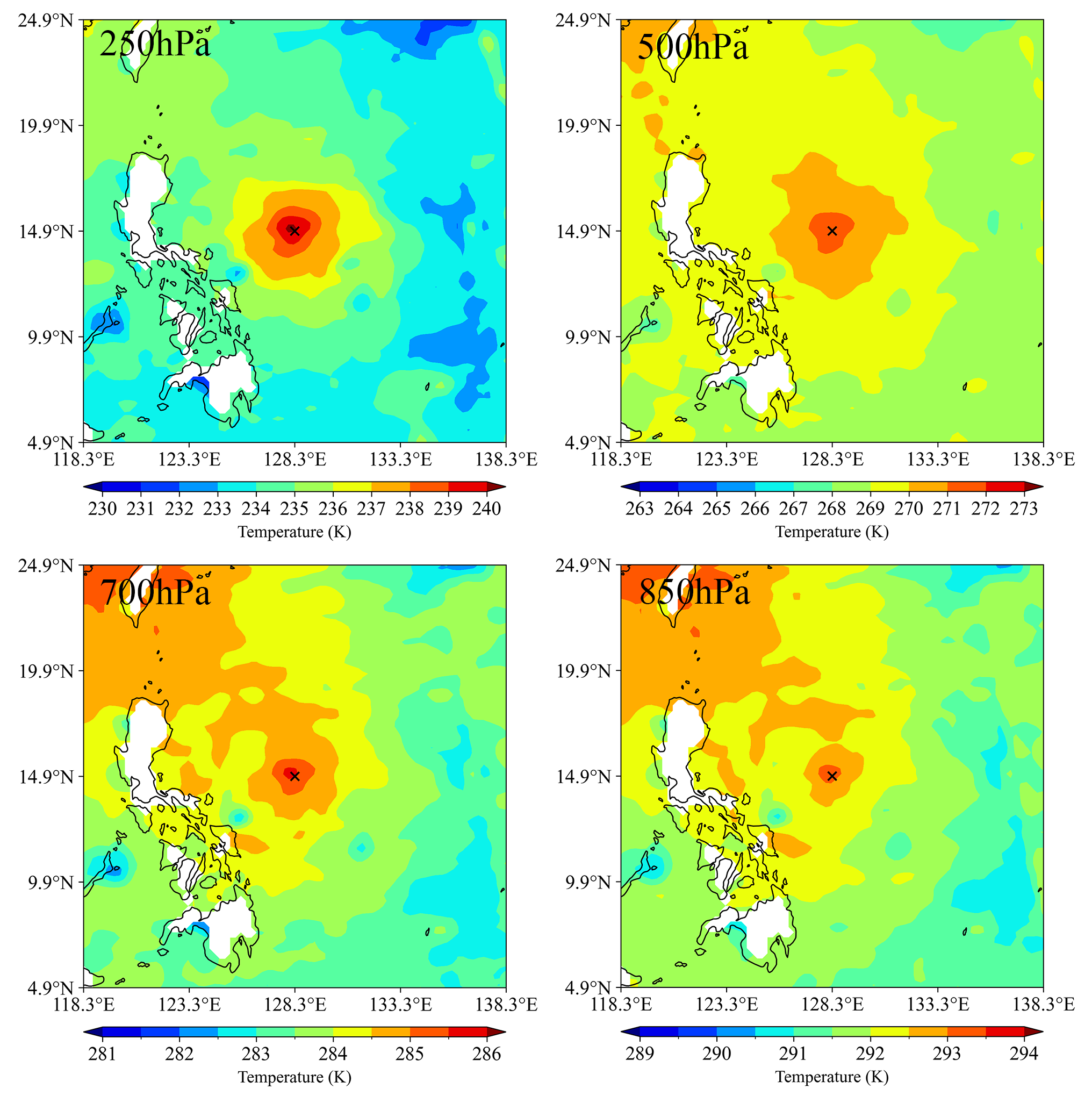 图1 2023年7月23日0600UTC不同气压层微波温度计大气反演温度空间分布