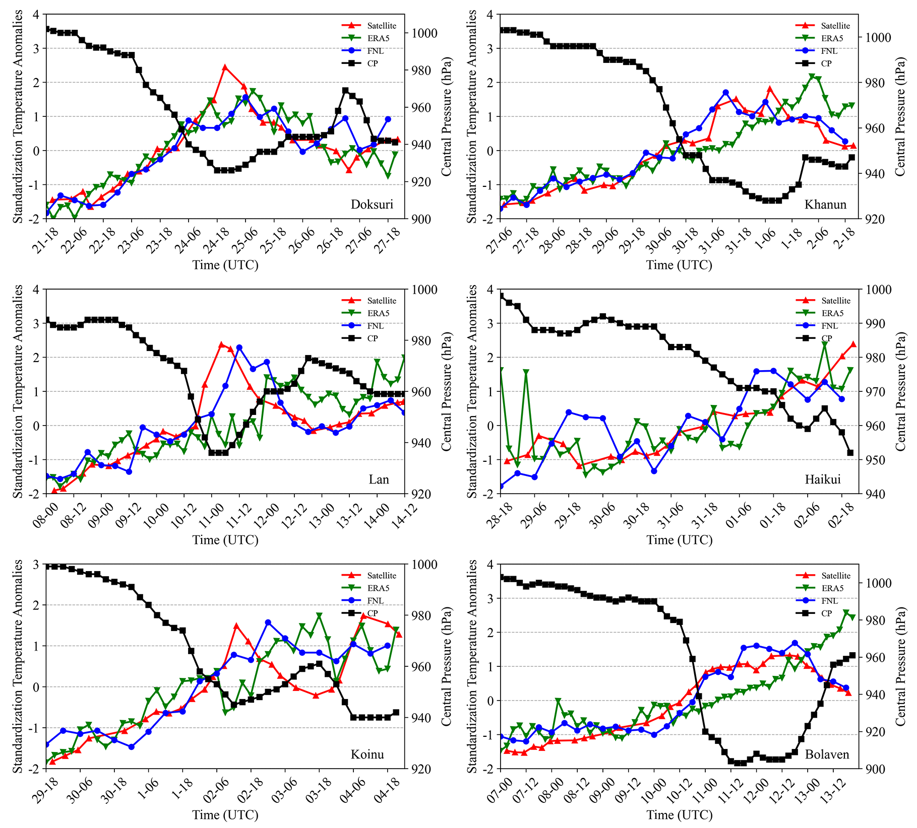 图3 不同台风暖核强度随时间的变化(红:卫星资料;绿:ERA5;蓝:GDAS-FNL;黑:中心气压)