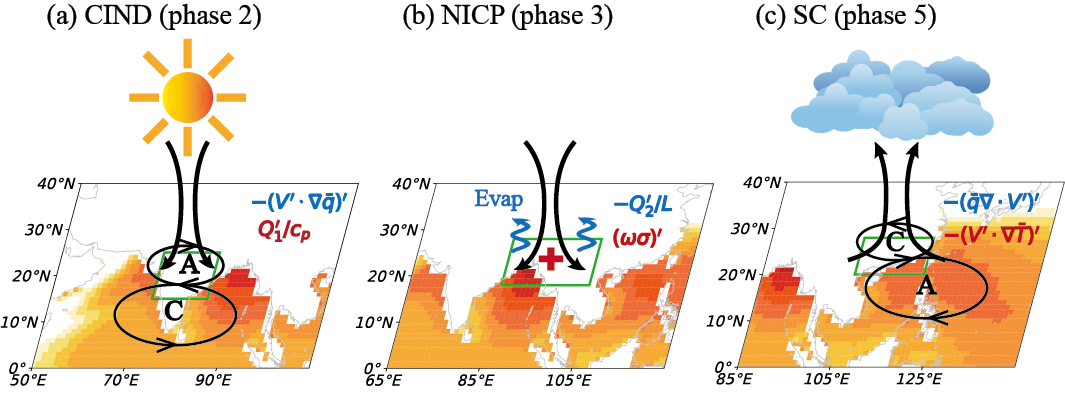 图1 QBWO驱动区域湿热浪高发的物理机制示意图:(a)印度中部,(b)中南半岛北部,(c)华南地区。黑色箭头代表10–30天的水平环流异常(“C”代表气旋,“A”代表反气旋)和垂直环流异常;蓝色符号和文字表示关键增湿过程,红色符号和文字表示关键的增暖过程。其中一杠和一撇分别代表>30天和10–30天分量。太阳代表晴空、云代表深对流、海洋上的红色阴影表示背景湿度场。