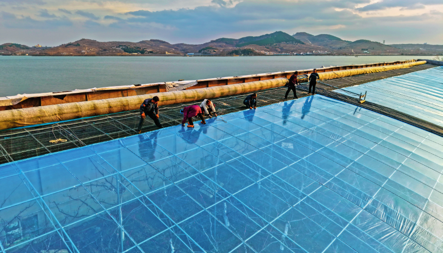 在山东省烟台市福山区张格庄镇,农民为樱桃大棚更换新的塑料薄膜(2025 年 12 月 11 日摄) 新华社发(孙文潭摄)