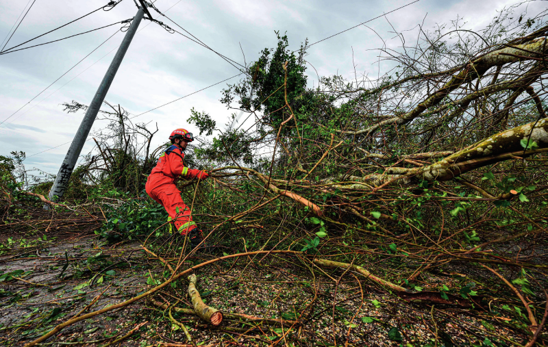 在海南省澄迈县,澄迈县消防救援大队救援人员在清理被台风刮倒的大树(2024 年 9 月 7 日摄) 蒲晓旭摄 / 本刊