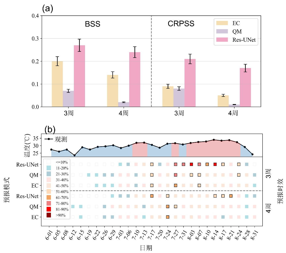 图1. 极端高温次季节预测技巧评估。(a)2019–2022年期间,EC、QM和Res-UNet在3–4周预报时效下的布莱尔技巧评分(BSS)和连续分级概率技巧评分(CRPSS)。所有指标均基于1000次自助法(bootstrap)重采样估计的95%置信区间进行评估。(b)观测值(上半部分;单位:℃)及Res-UNet、QM和EC在2022年长江中下游地区3–4周预报时效的极端高温概率预测(下半部分;单位:%)。上半部分中红色区域表示观测到的极端高温,其余为蓝色。下半部分的小方格以不同颜色表示概率等级,带黑色边框的方格表示概率大于50%